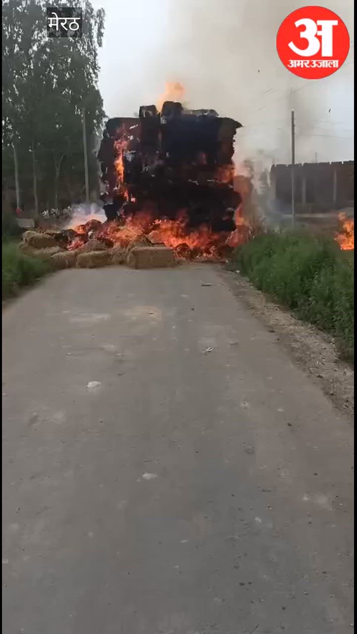 Meerut:हाईटेंशन लाइन से टकराकर पुआल से भरी ट्रैक्टर ट्रॉली में लगी आग ...