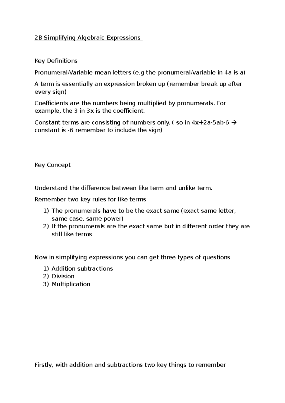 2B & 2C Simplifying Algebraic Expressions: Key Concepts & Rules - Studocu