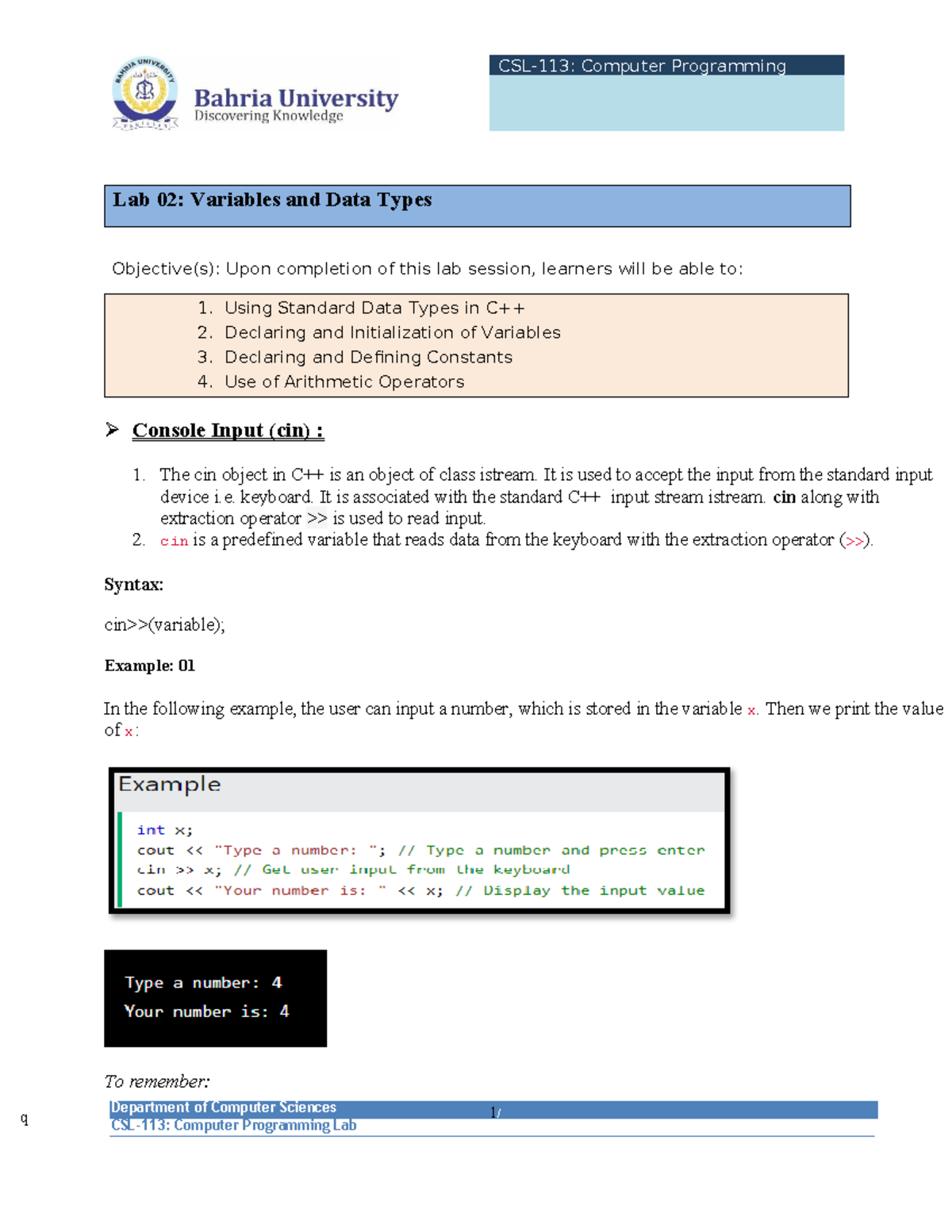 Computer Programming Lab 02: Variables & Data Types Overview - Studocu