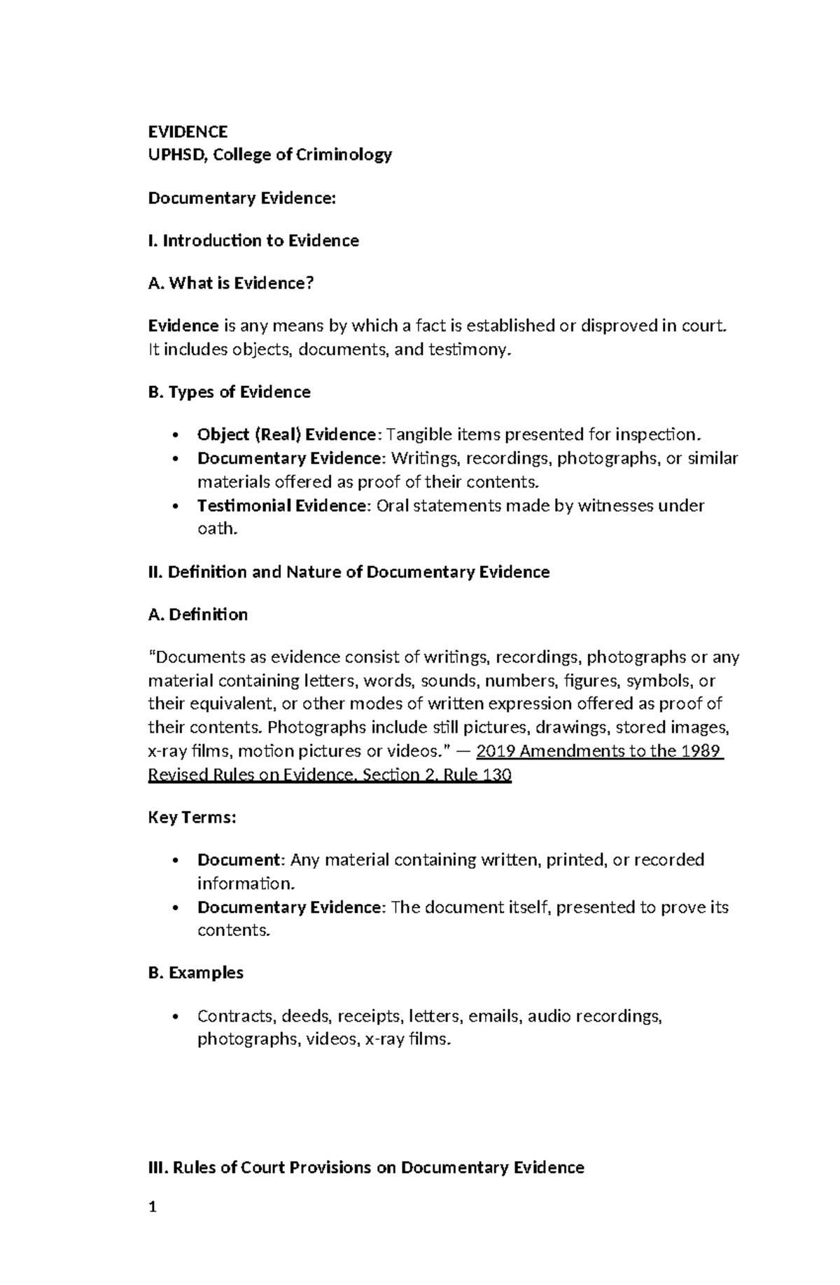 Lecture on Documentary Evidence (CRIM) - Key Concepts & Rules - Studocu