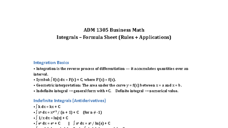 ADM 1305 Business Integrals Formula Sheet: Key Concepts & Rules - Studocu