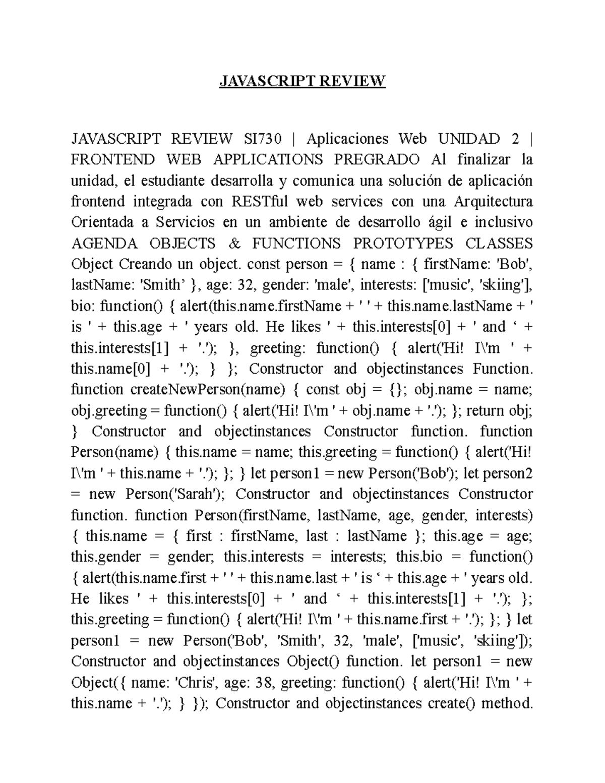 Javascript Review - SI730 Aplicaciones Web Unidad 2 - Studocu