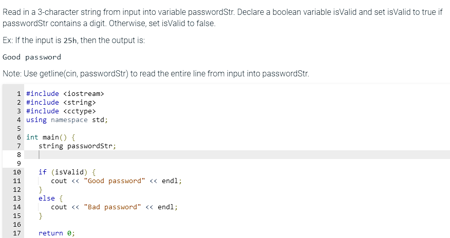 Read in a 2-character string from input into variable passwordStr ...
