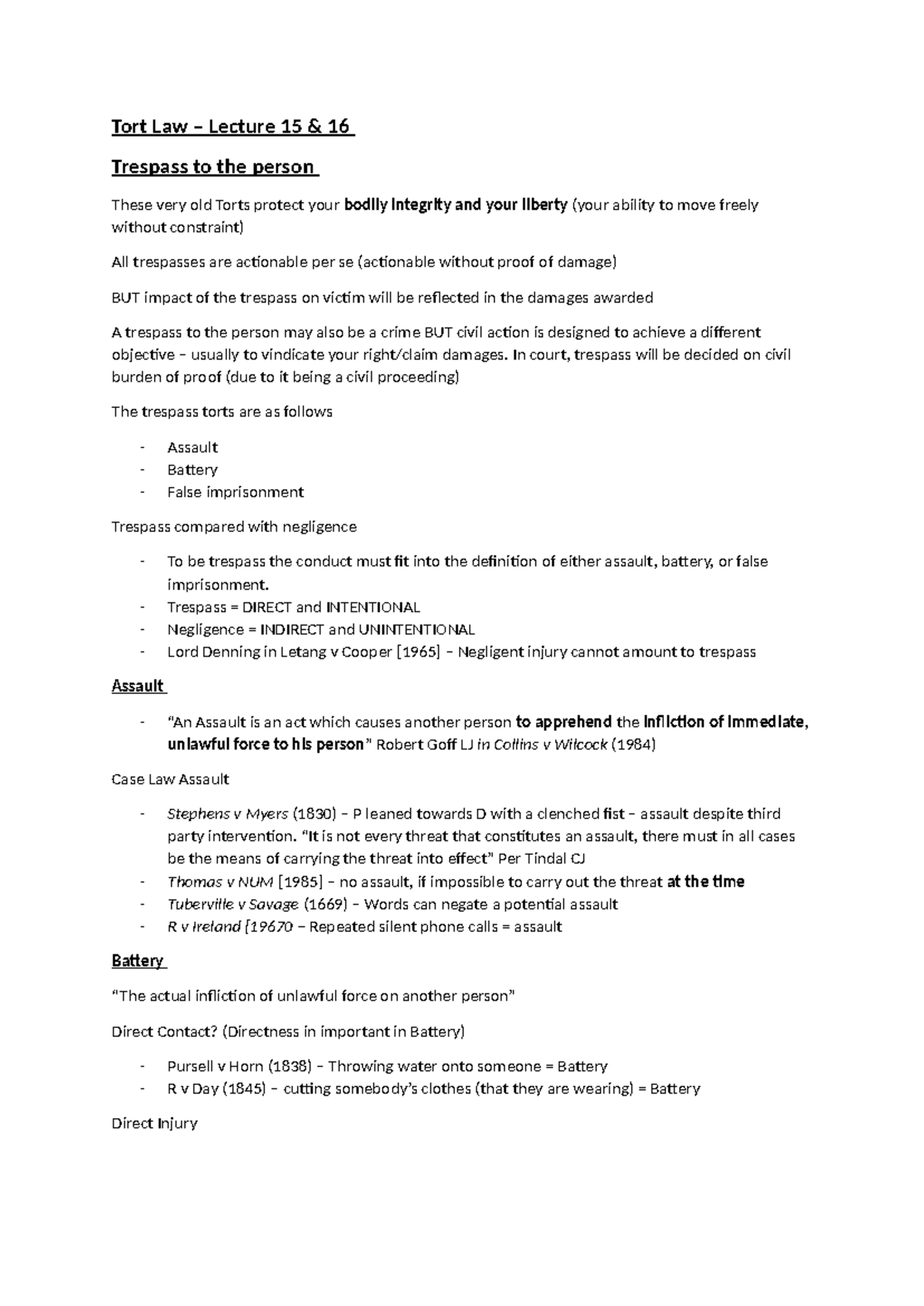 Tort Law lecture 15&16 - Tort Law – Lecture 15 & 16 Trespass to the ...