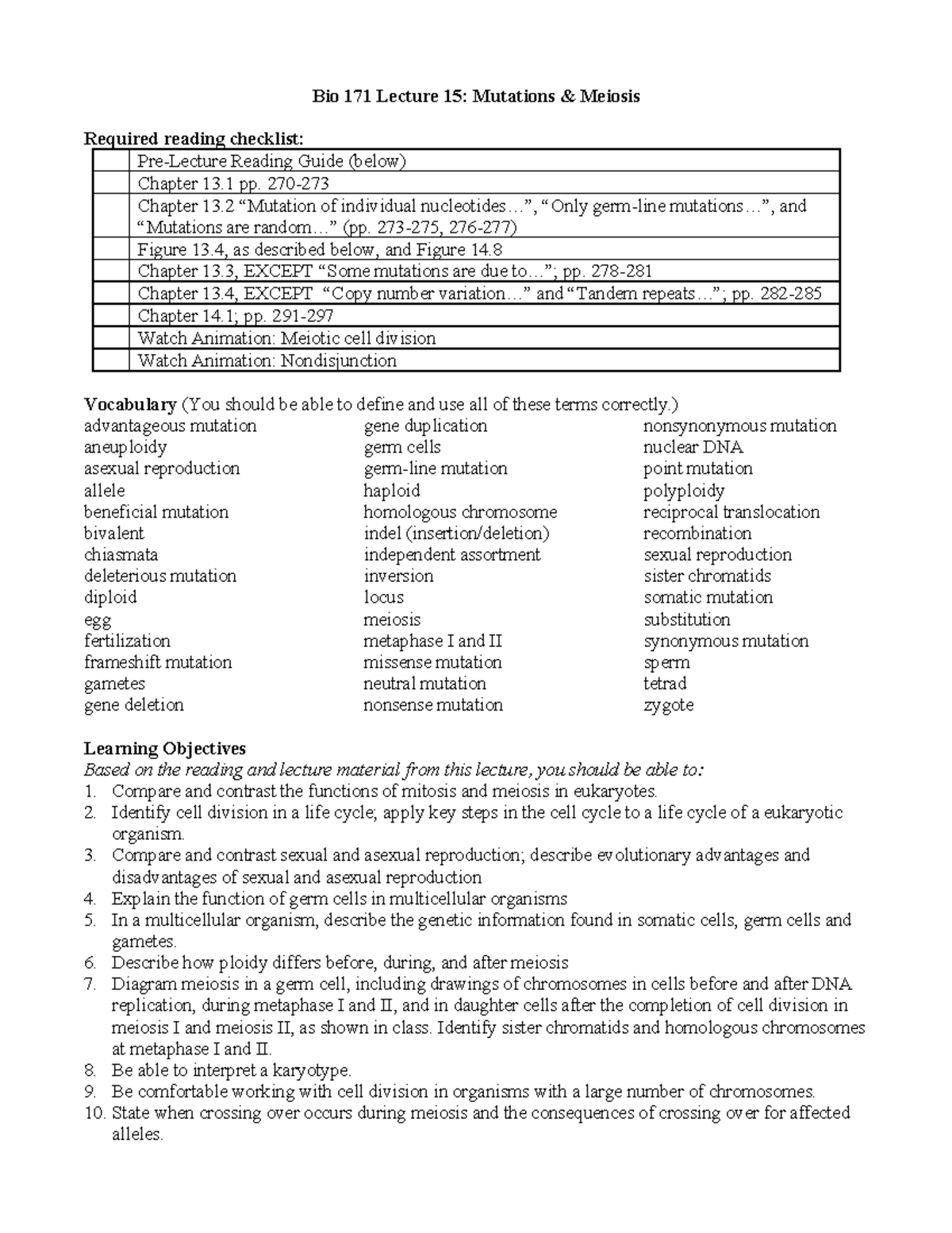 Bio 171 Lecture 15: Understanding Mutations and Meiosis Processes - Bio ...