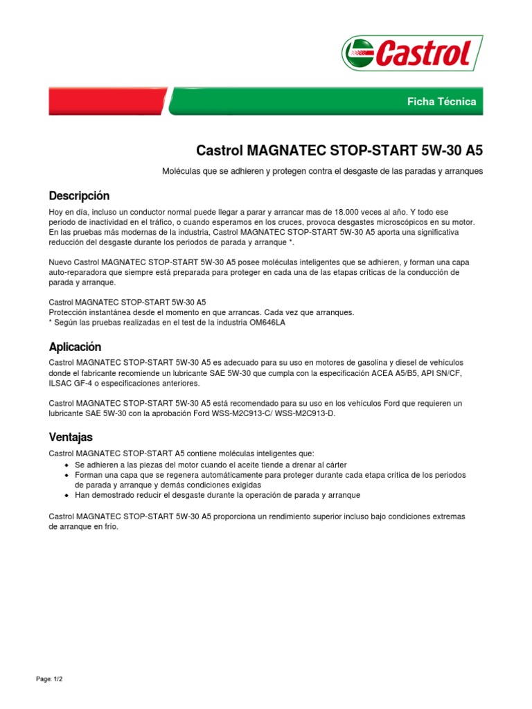 PDS Castrol MAGNATEC STOP-START 5W-30 A5 | PDF | Lubricante | Ciencias ...
