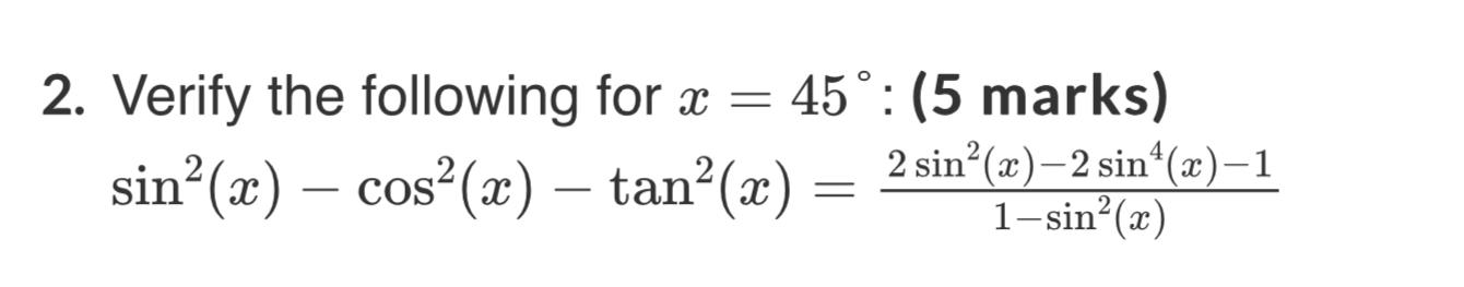 Solved 2. Verify the following for x=45∘: (5 marks) | Chegg.com