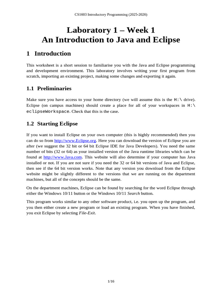 CS1603 Worksheet 1 - Introduction To Java and Eclipse (2025-2026) | PDF ...