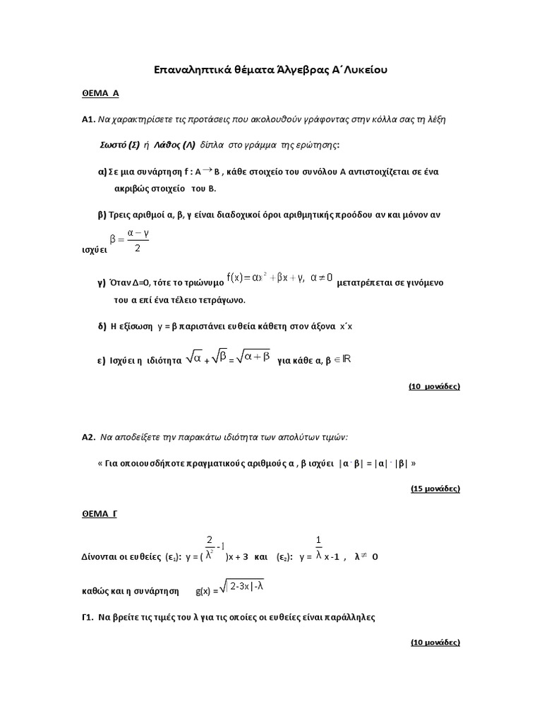 Επαναληπτικά Θέματα Άλγεβρας Α Λυκείου | PDF