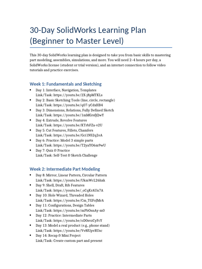 SolidWorks 30 Day Learning Plan | PDF | 3 D Computer Graphics
