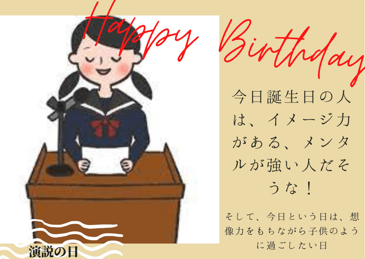 今日は「演説の日」。 お誕生日おめでとうございます! 今日誕生日の人は、イメージ力がある、クリエイティブ、意志が強い、勇敢、有能、独創的 ...