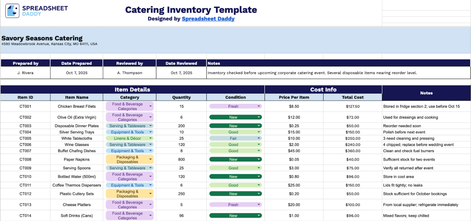 Free☝️ Catering Inventory Spreadsheet Template (Google Sheets, Excel ...