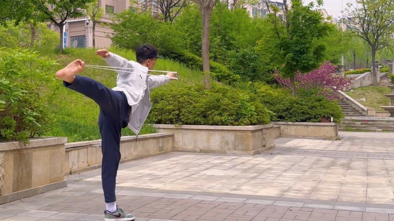 Daring one-legged slingshot stunt in China