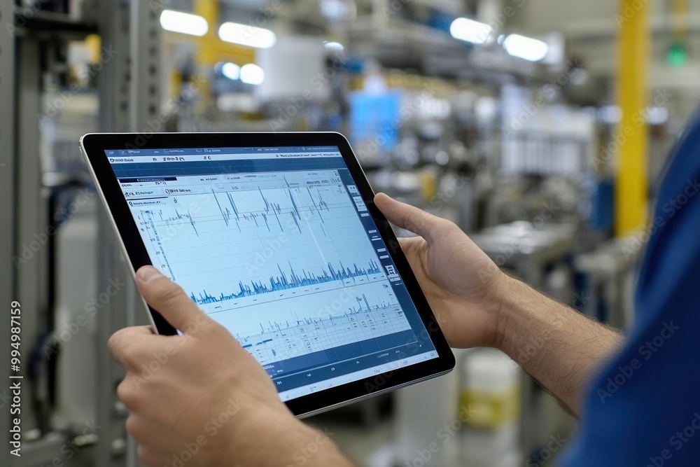 Factory worker using a tablet to monitor SPC control charts in real ...