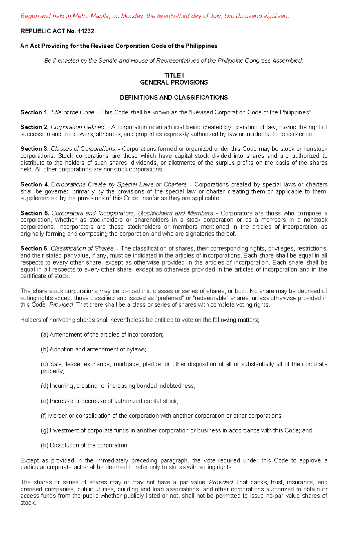 Revised Corporation Code - Begun and held in Metro Manila, on Monday ...
