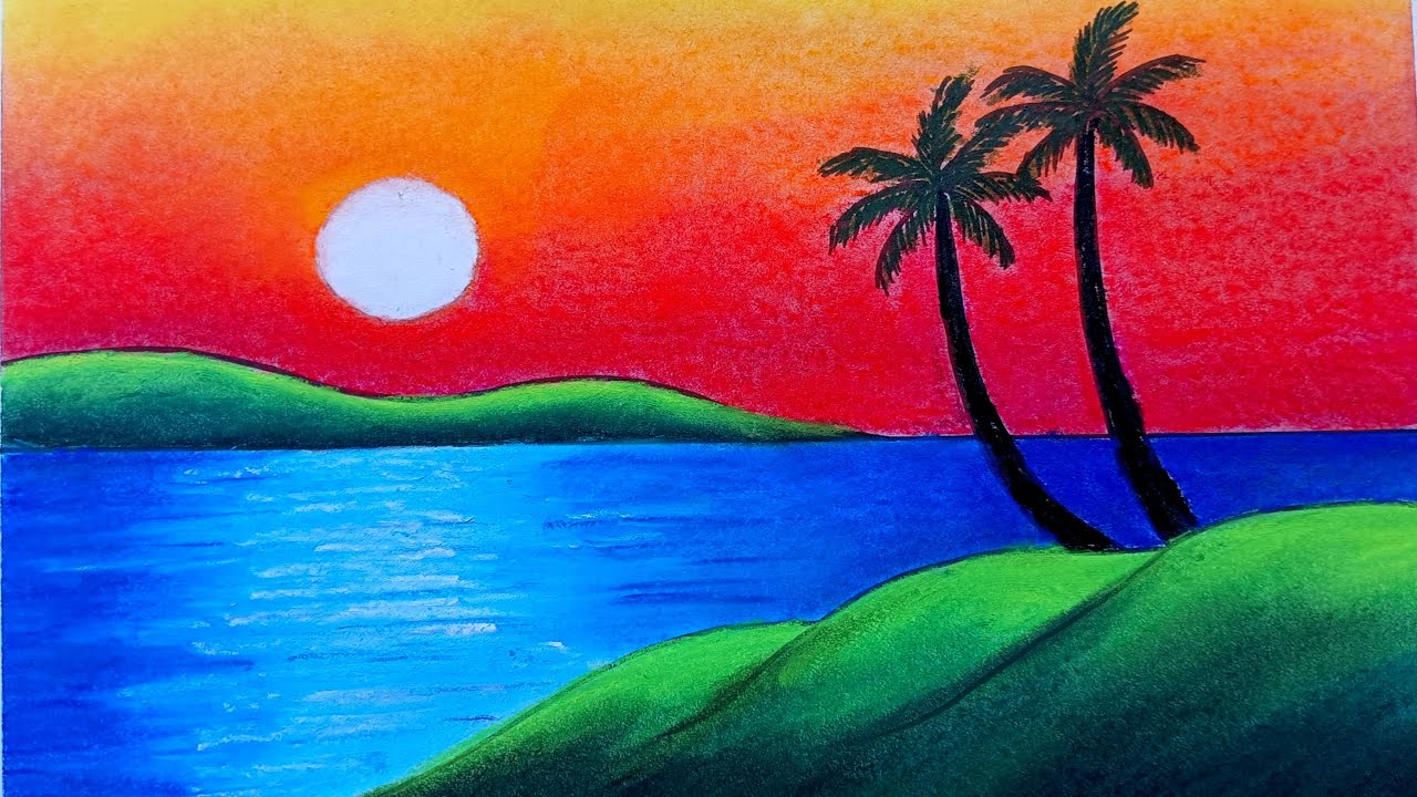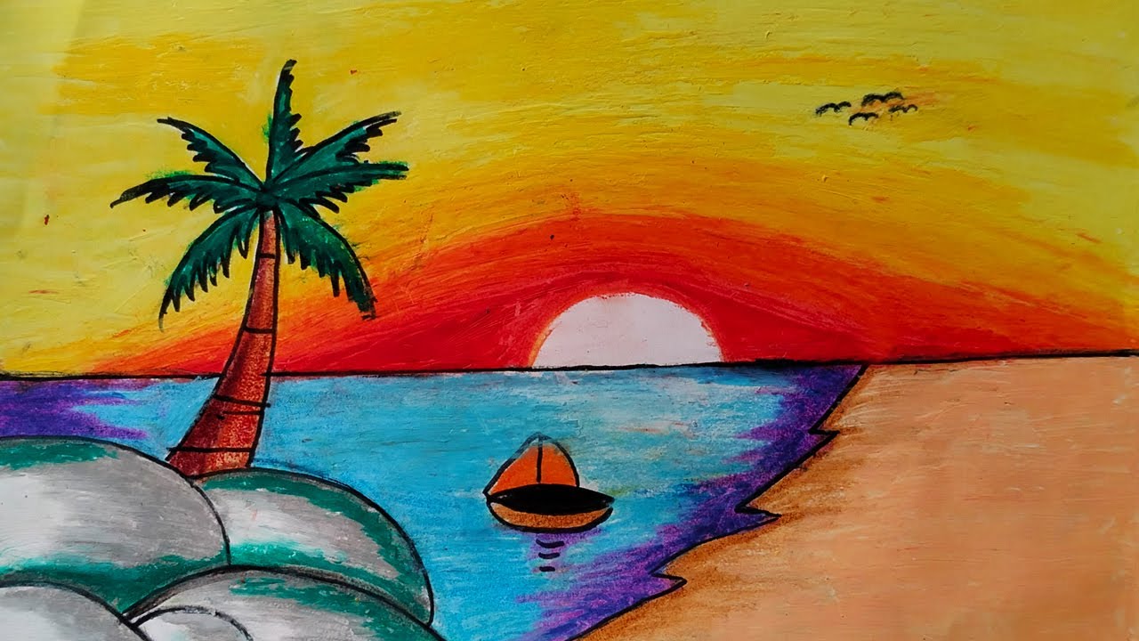 How To Draw Sunset Scenery With Oil Pastels |Drawing Sunset Scenery ...