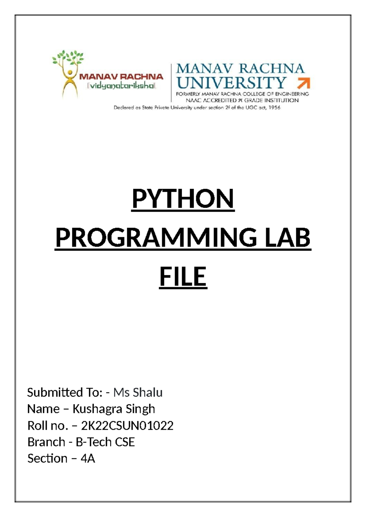 Python Programming Lab - B-Tech CSE (2K22CSUN) - Studocu