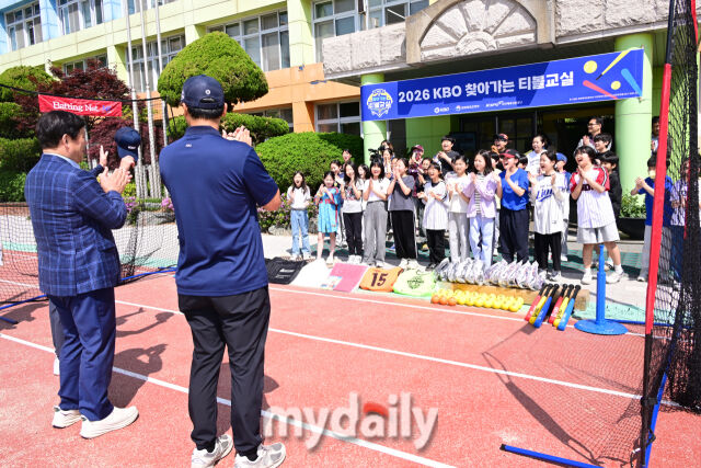 [MD포토] 학생들과 인사하는 허구연 KBO 총재