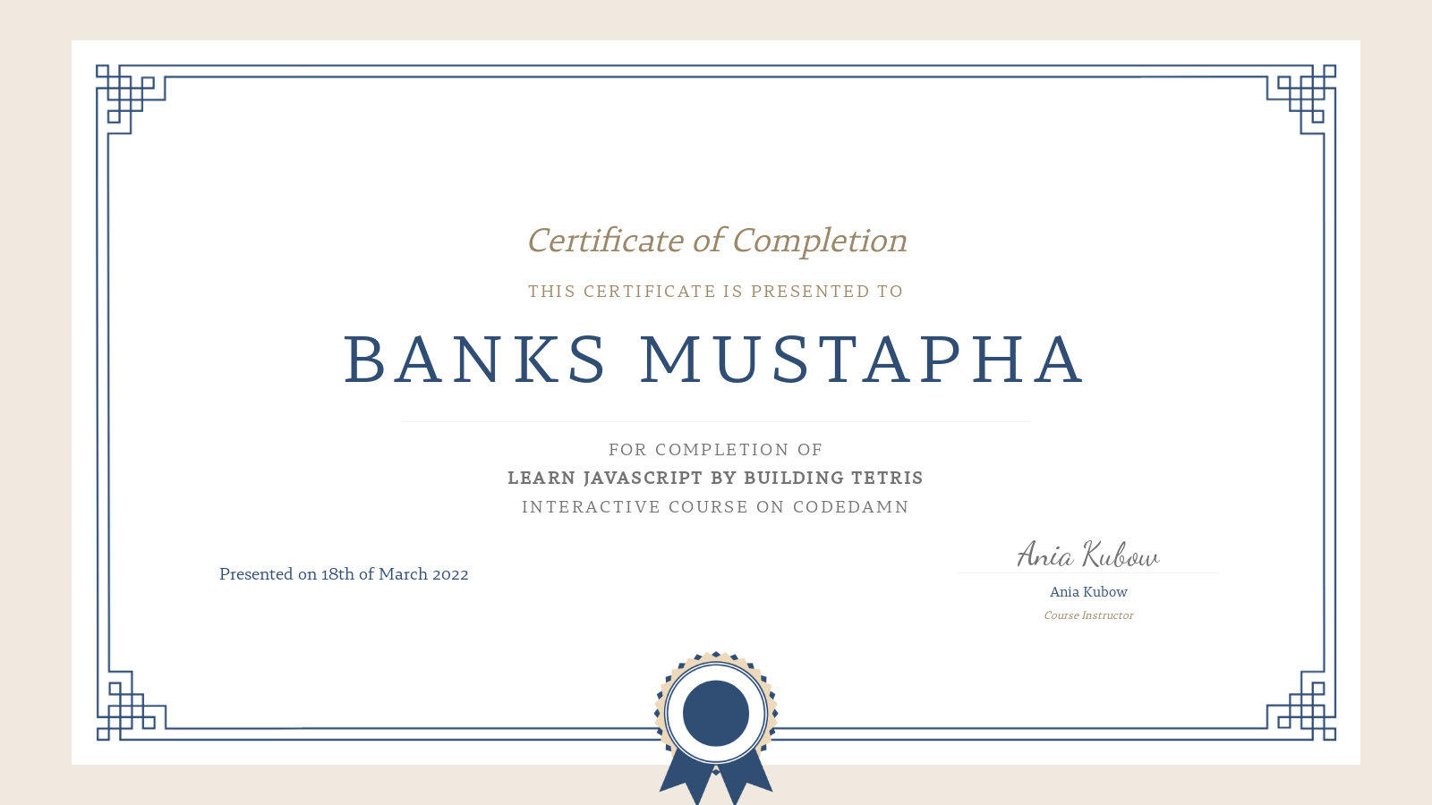 Banks Mustapha's certification for Learn JavaScript by building Tetris ...