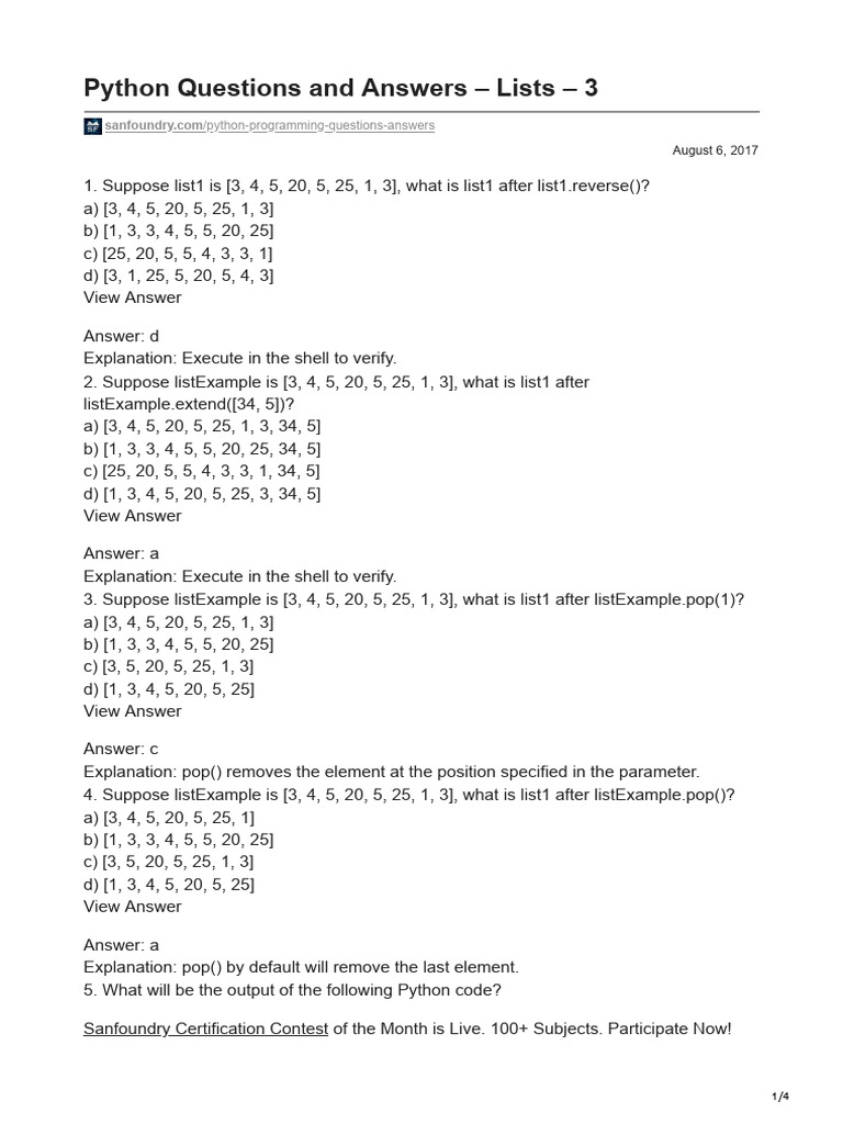 Python Questions and Answers Lists 3 | PDF | Computer Programming ...