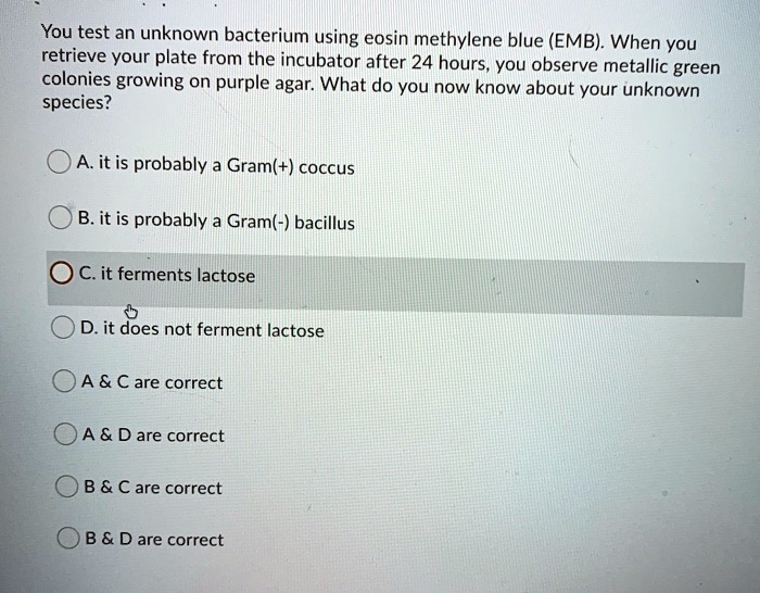 SOLVED: You test an unknown bacterium using eosin methylene blue (EMB ...
