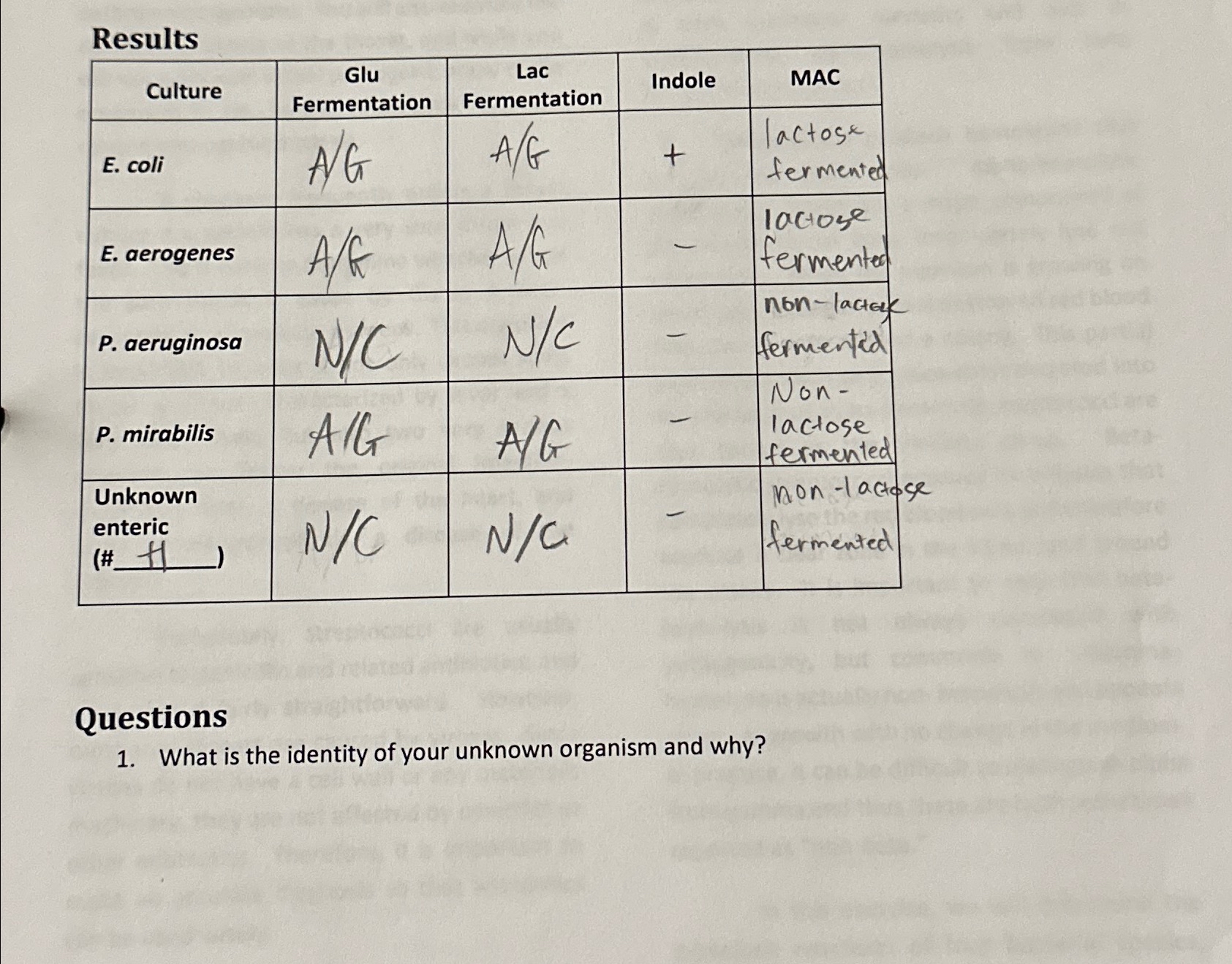 Biochemical Testing for Unknown Bacteria: Results and | Course Hero