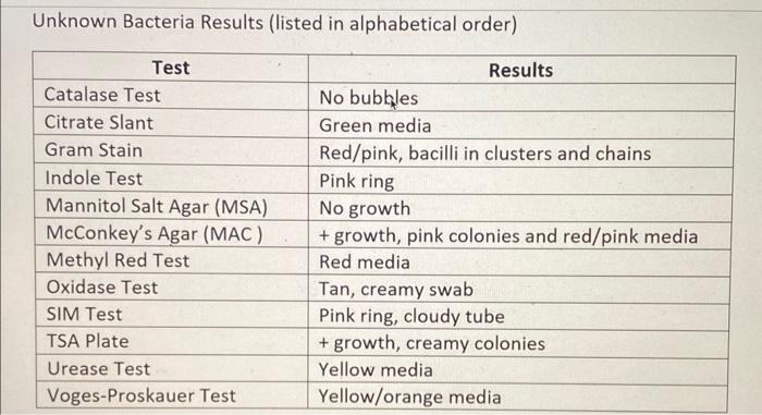 Solved Find the unknown bacteria here using two tests and | Chegg.com