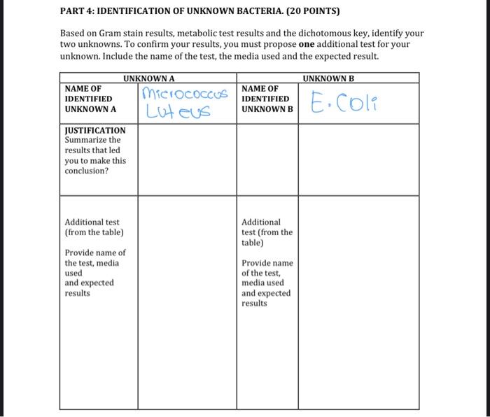 PART 4: IDENTIFICATION OF UNKNOWN BACTERIA. (20 | Chegg.com