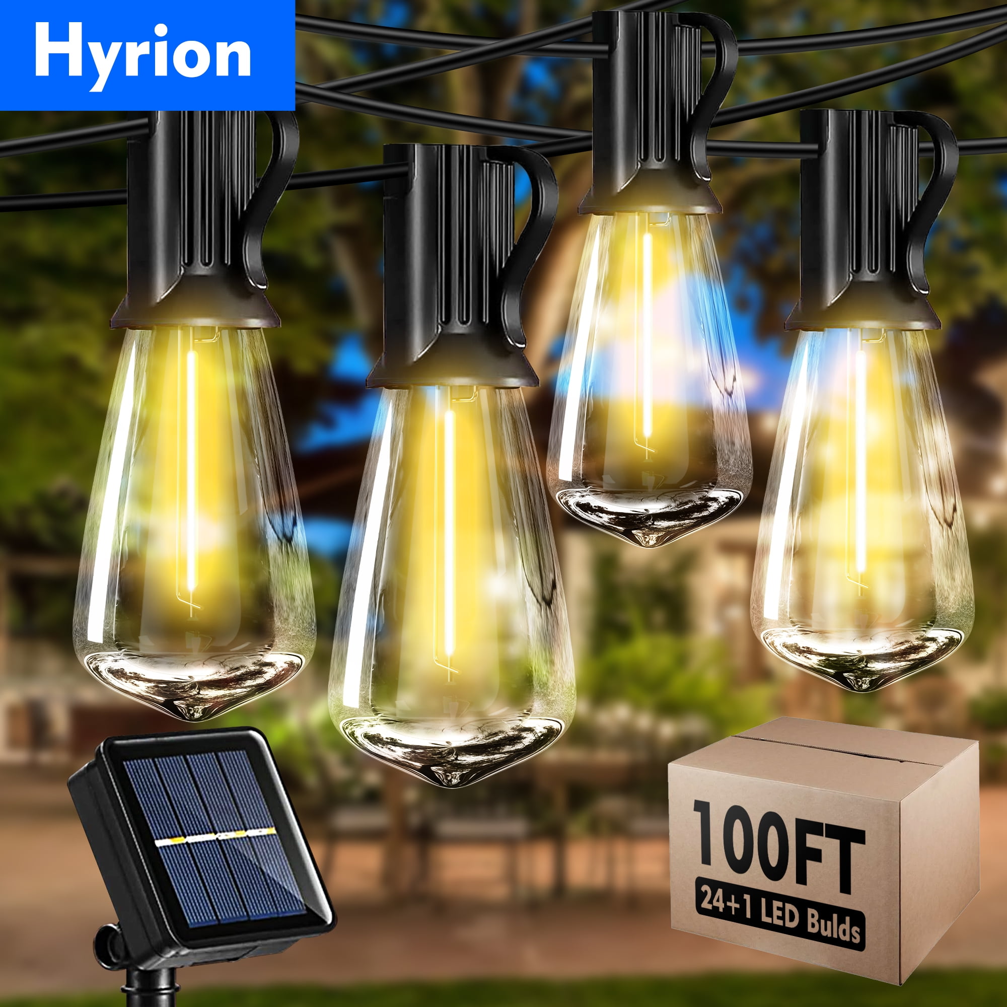 Hyrion Solar Outdoor String Lights, 100ft with 24 ST38 Plastic Bulbs ...