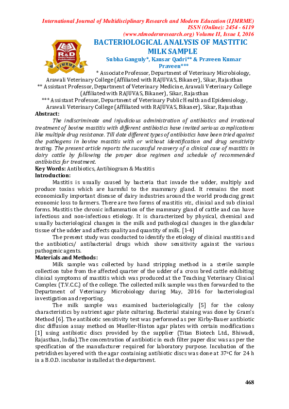 (PDF) BACTERIOLOGICAL ANALYSIS OF MASTITIC MILK SAMPLE