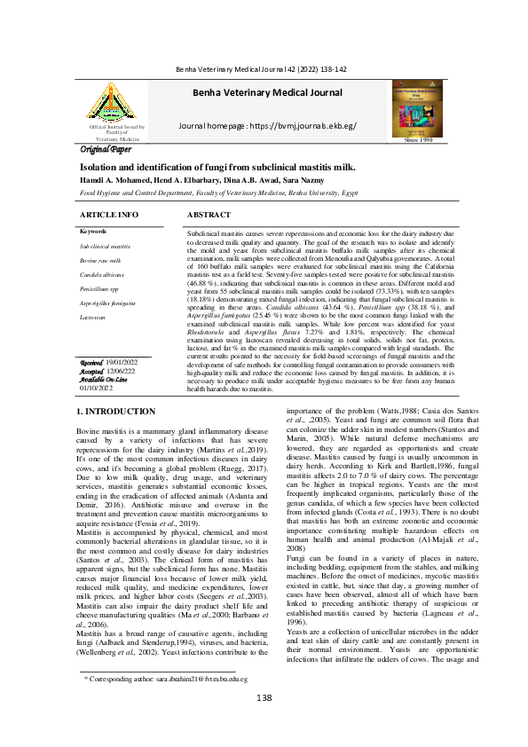 (PDF) Isolation and identification of fungi from subclinical mastitic milk