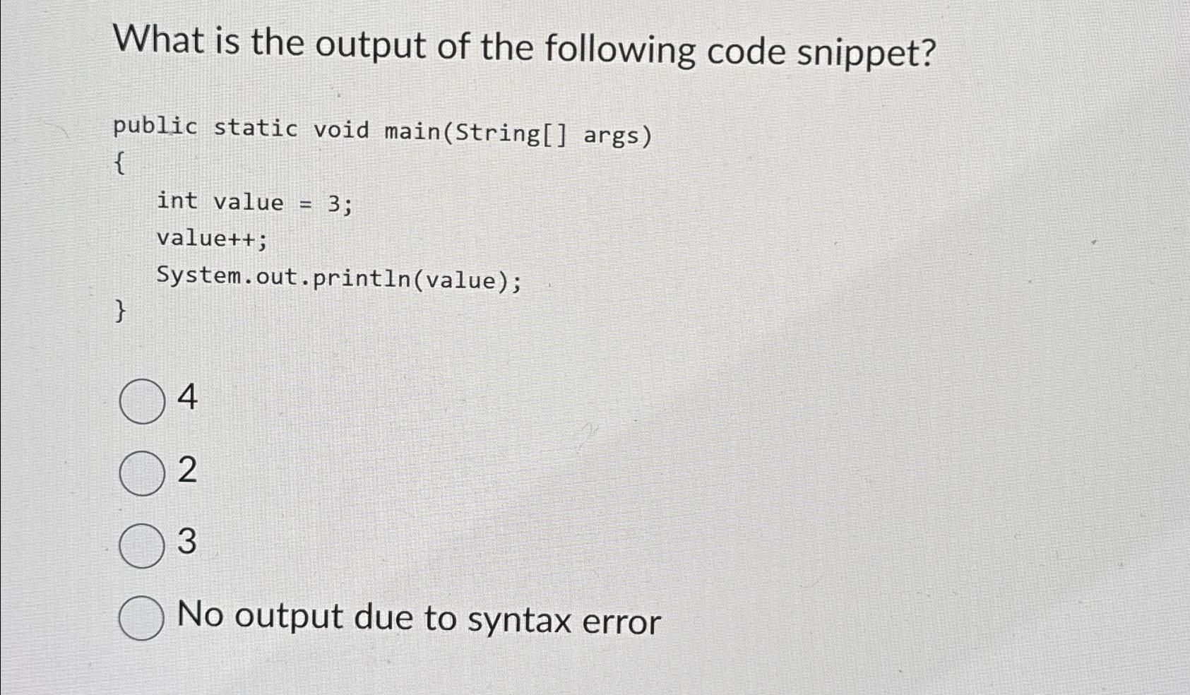 Solved What is the output of the following code snippet? int | Chegg.com