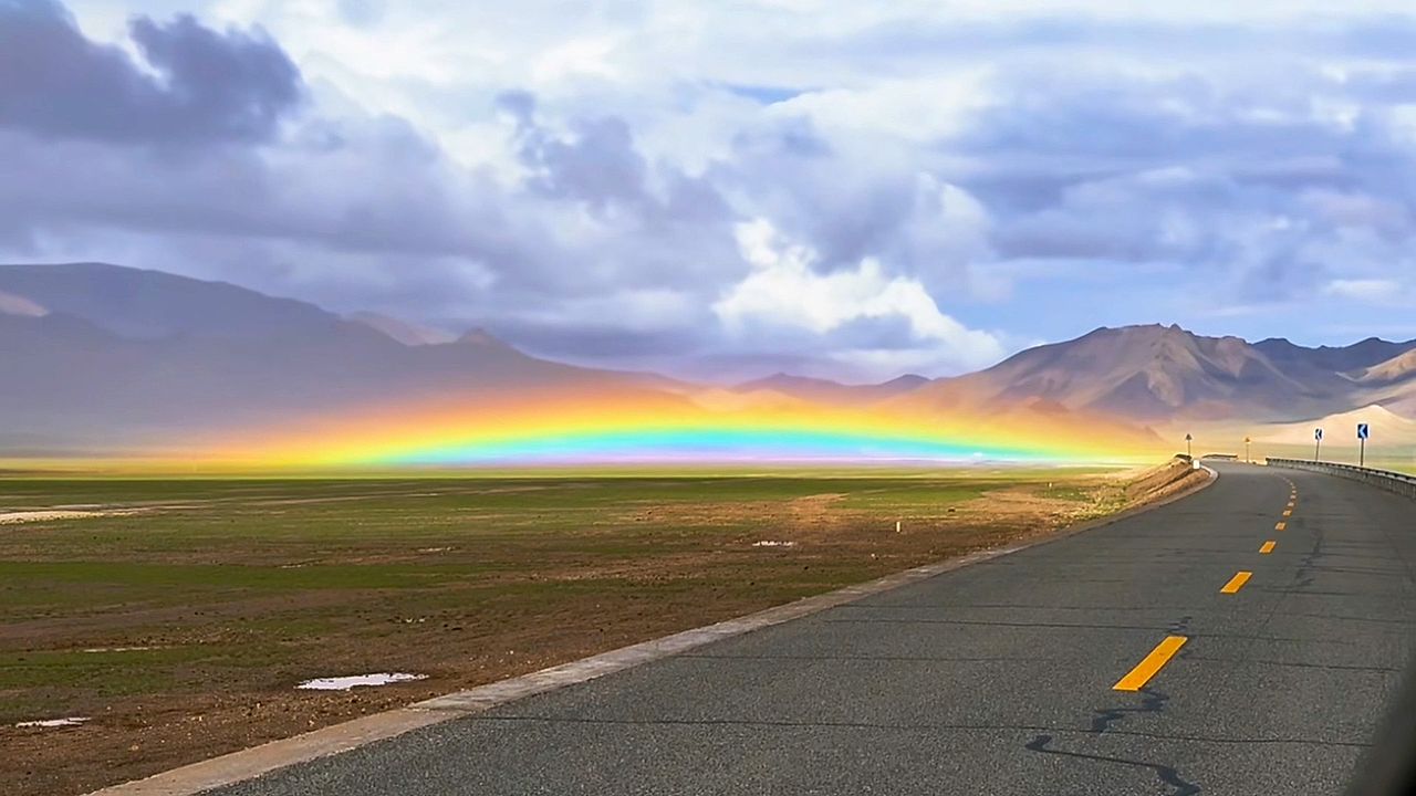 Extremely rare ground-hugging rainbow appears near mountain range in Tibet