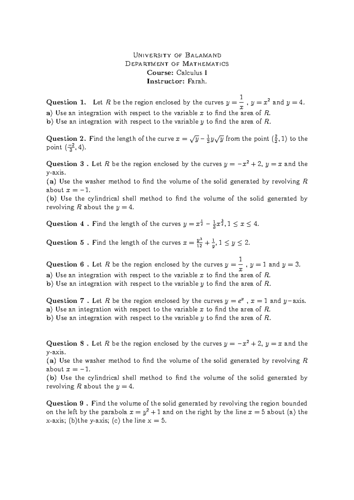 Calculus I (MATH101) Set 4 Area and Volume Problems - Studocu
