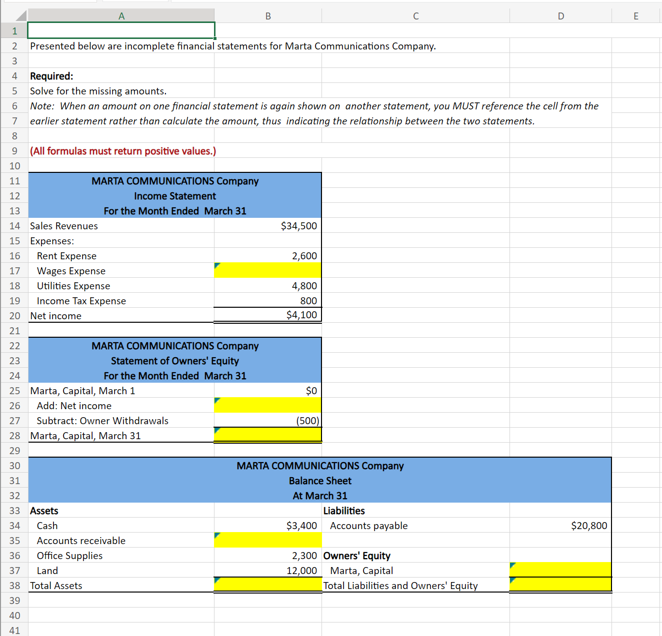 Solved PLEASE USE EXCEL FORMULAS TO SOLVE THIS AND CELL | Chegg.com
