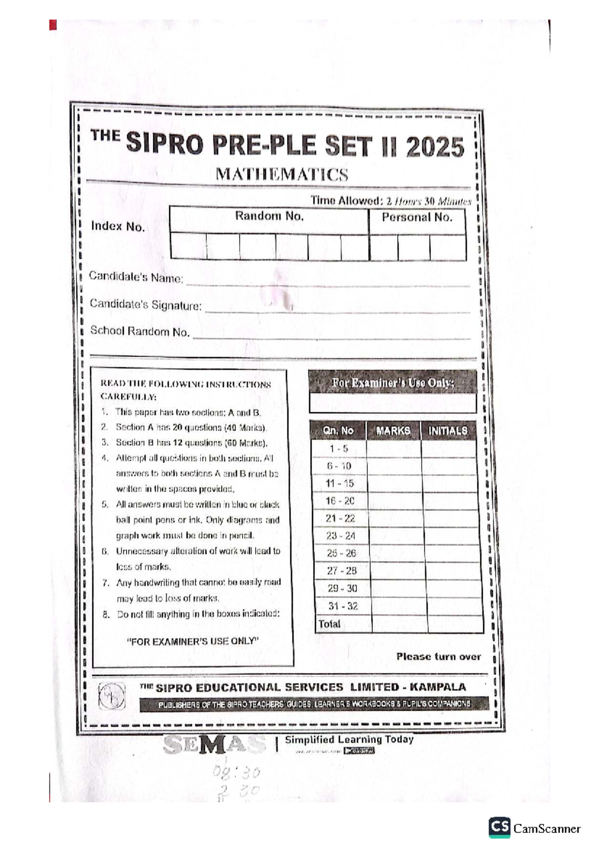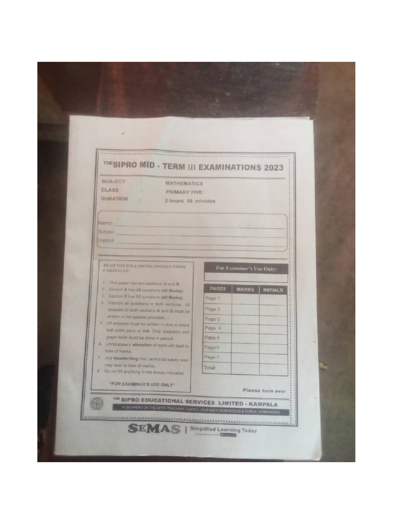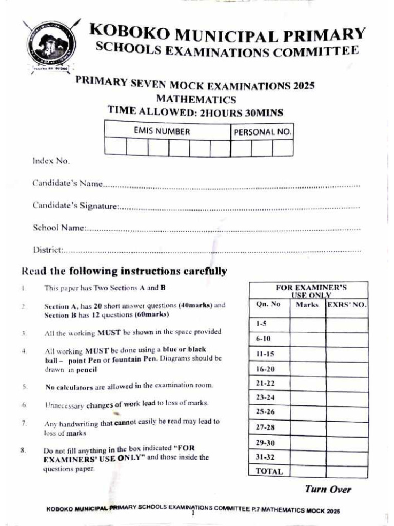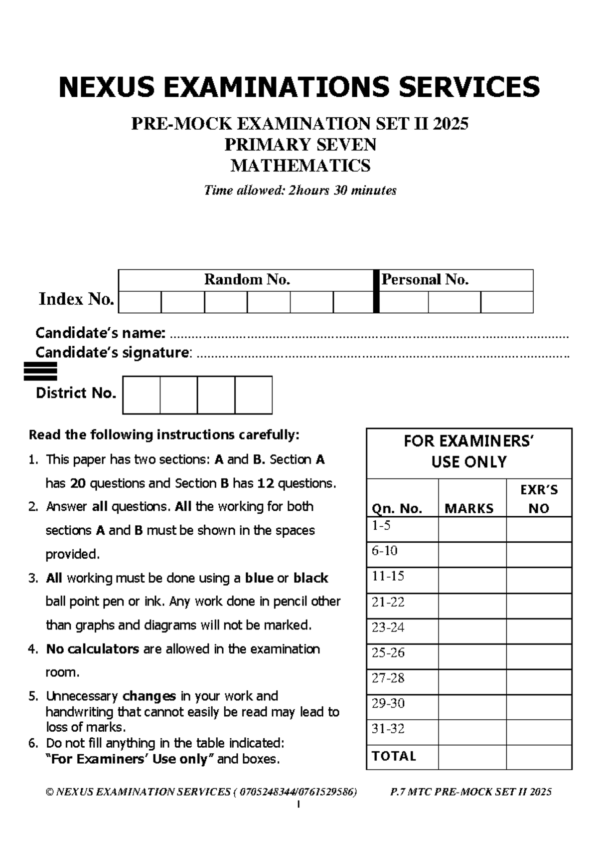 P.7 MTC SET II 2025 Mathematics Pre-Mock Examination - Studocu