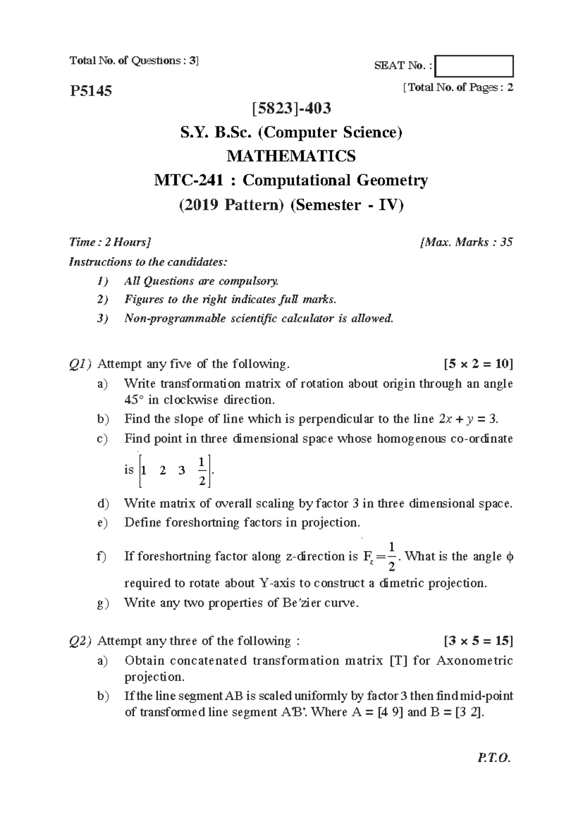 S.Y. B.Sc. COMPUTER SCIENCE MTC 221: Computational Geometry Exam Paper ...