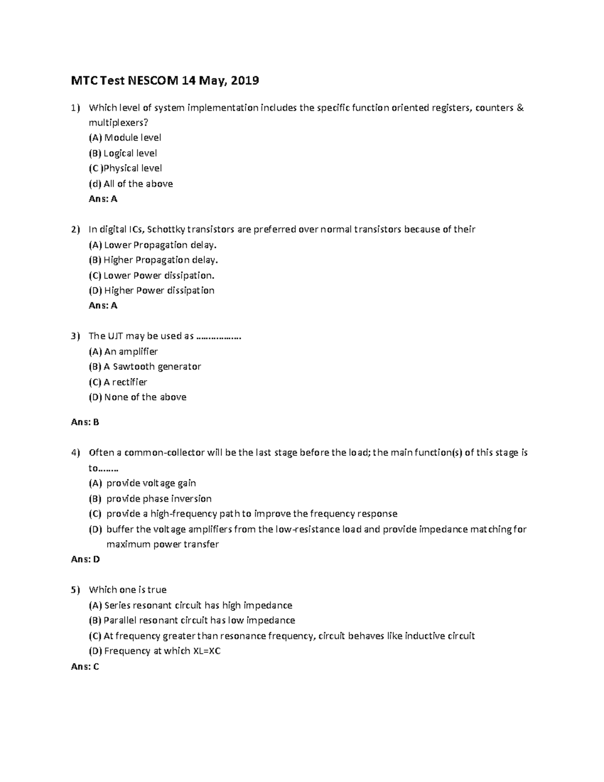 MTC Test NESCOM 2019: AM Electronics Exam Questions & Answers - Studocu