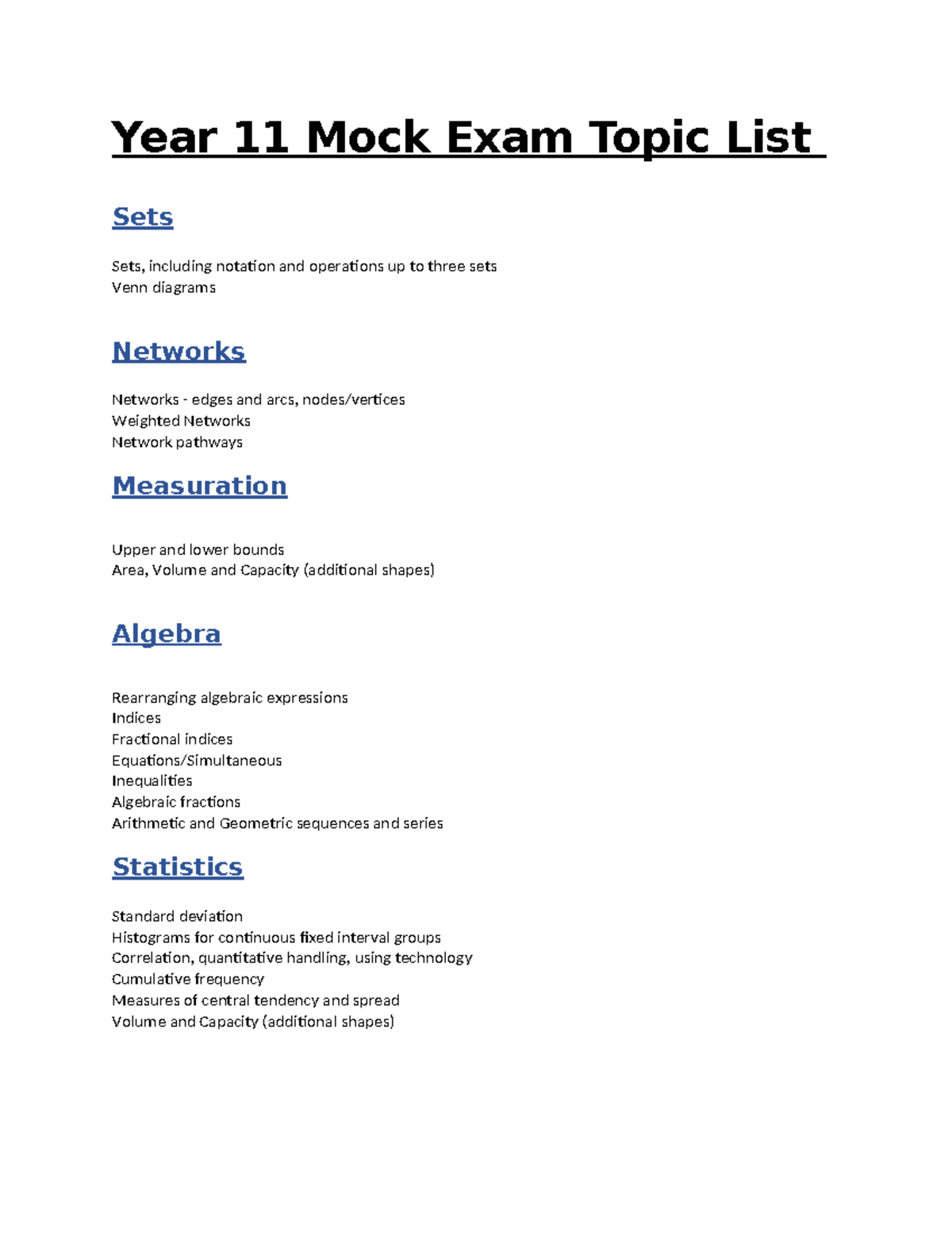 Year 11 Extended Mock Exam Topic List: Sets, Algebra & Stats - Studocu