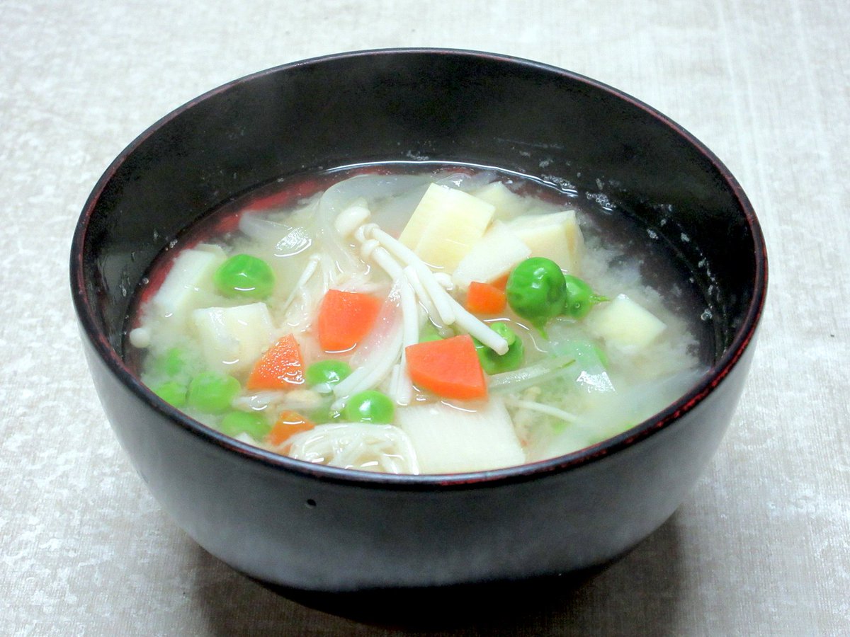 令和 8年 4月27日 月曜日 おはようございます ʕᵔᴥᵔʔ 今朝の #味噌汁 具材 人参 筍 玉葱 えんどう豆 えのき茸 いただきます ...