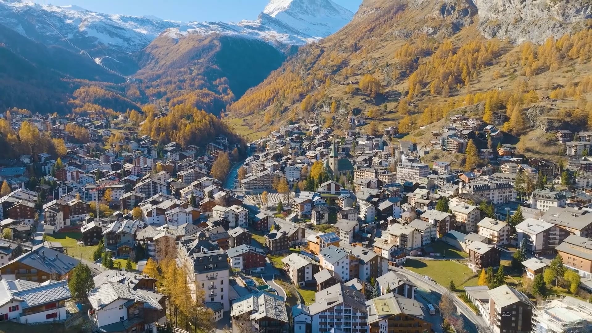 Zermatt, Switzerland: Drone views of ski resort at the Matterhorn