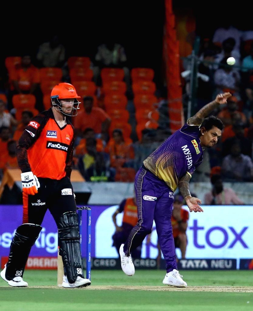 Hyderabad : KKR bowler Sunil Narine bowls during the IPL 2023 match