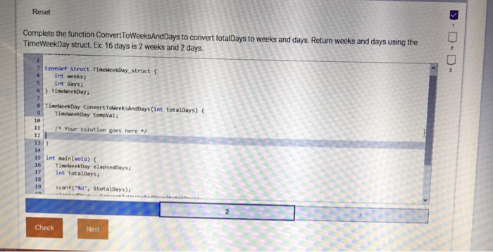 Solved Reset Complete the function ConvertToWeeksAndDays to | Chegg.com