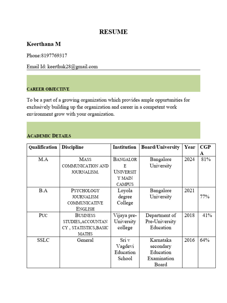 Keerthana. M (Resume) - 1 | PDF | Bangalore