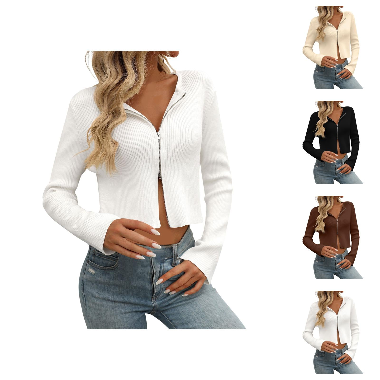 Cardigan Sweaters for Women 2025 Long Sleeve Zip Up Cropped Knitted ...