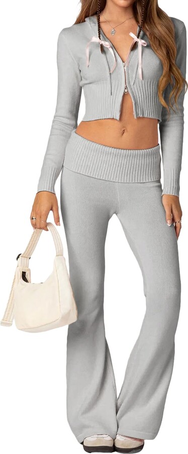 Womens Knit Sweater Two Piece Outfits for Women Long Sleeve Hooded Zip ...