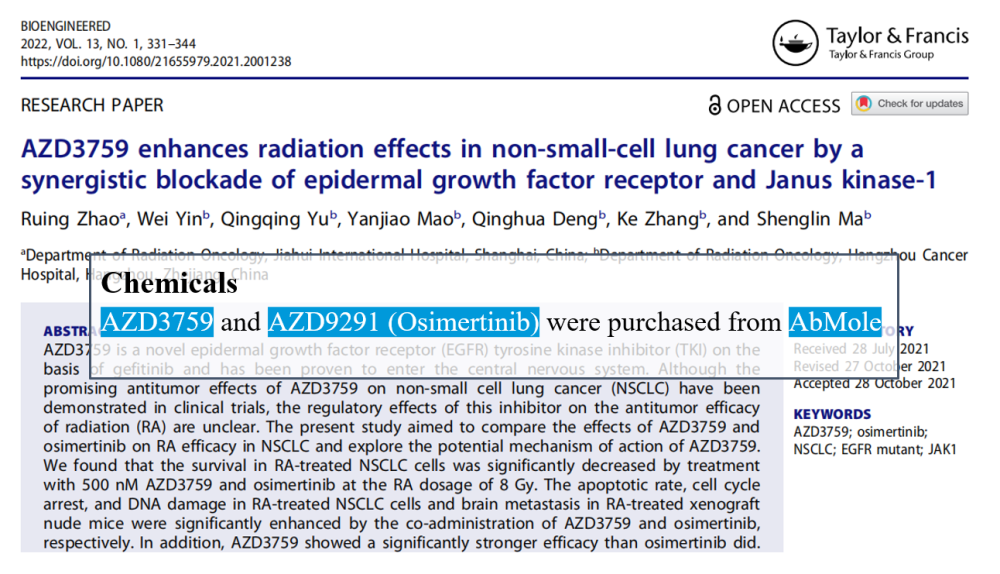 AbMole科研-AZD3759通过协同阻断表皮生长因子受体和Janus激酶-1增强非小细胞肺癌的辐射效应_腾讯新闻