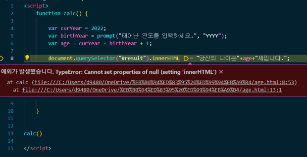 자바 스크립트 document.querySelector("#result").innerHTML 오류 : 지식iN