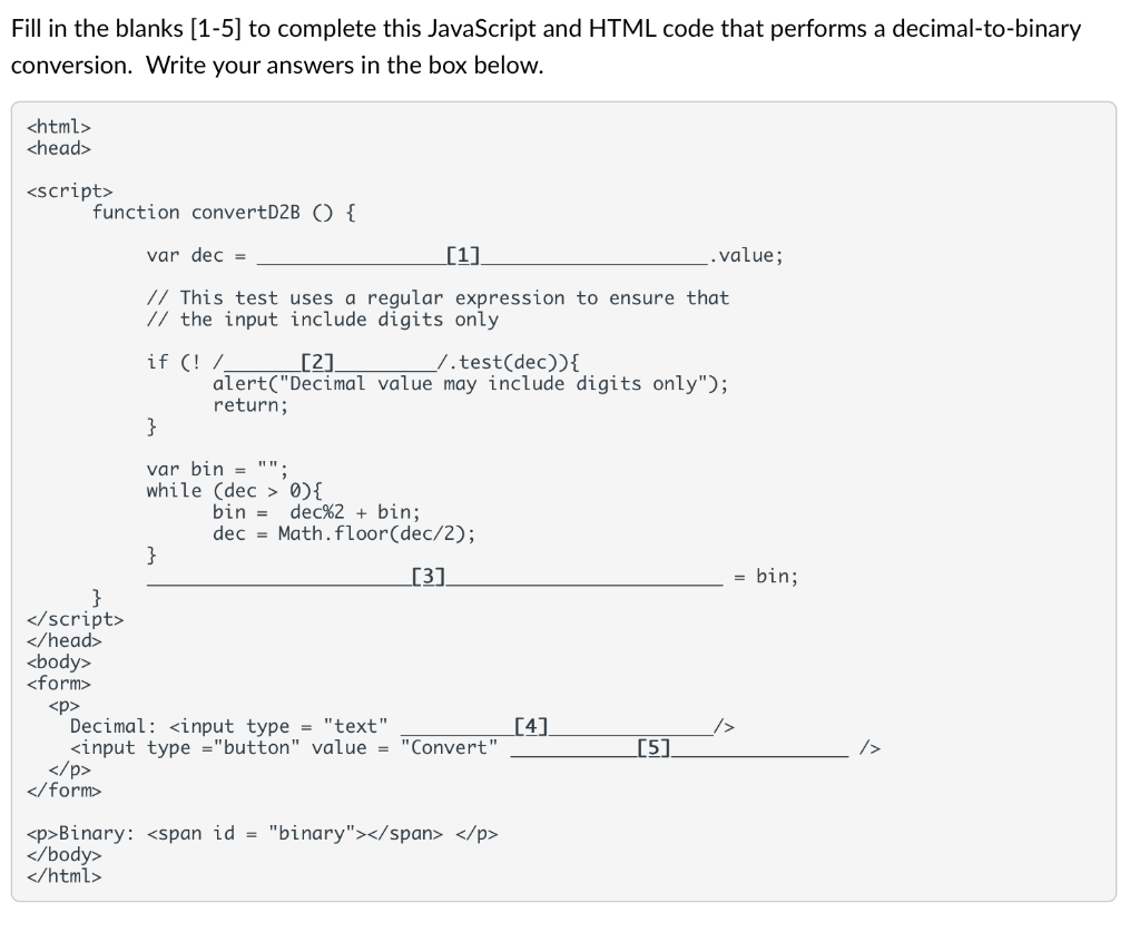 Solved Fill in the blanks (1-5) to complete this JavaScript | Chegg.com