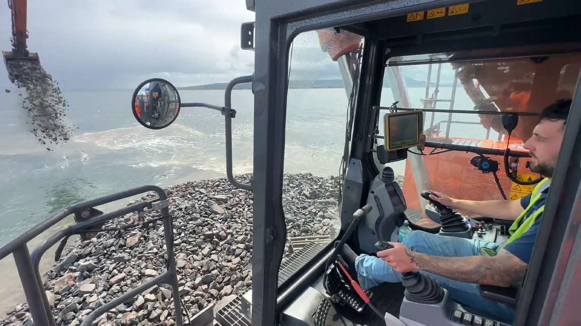 Giant excavator POV smooth and powerful rock dumping